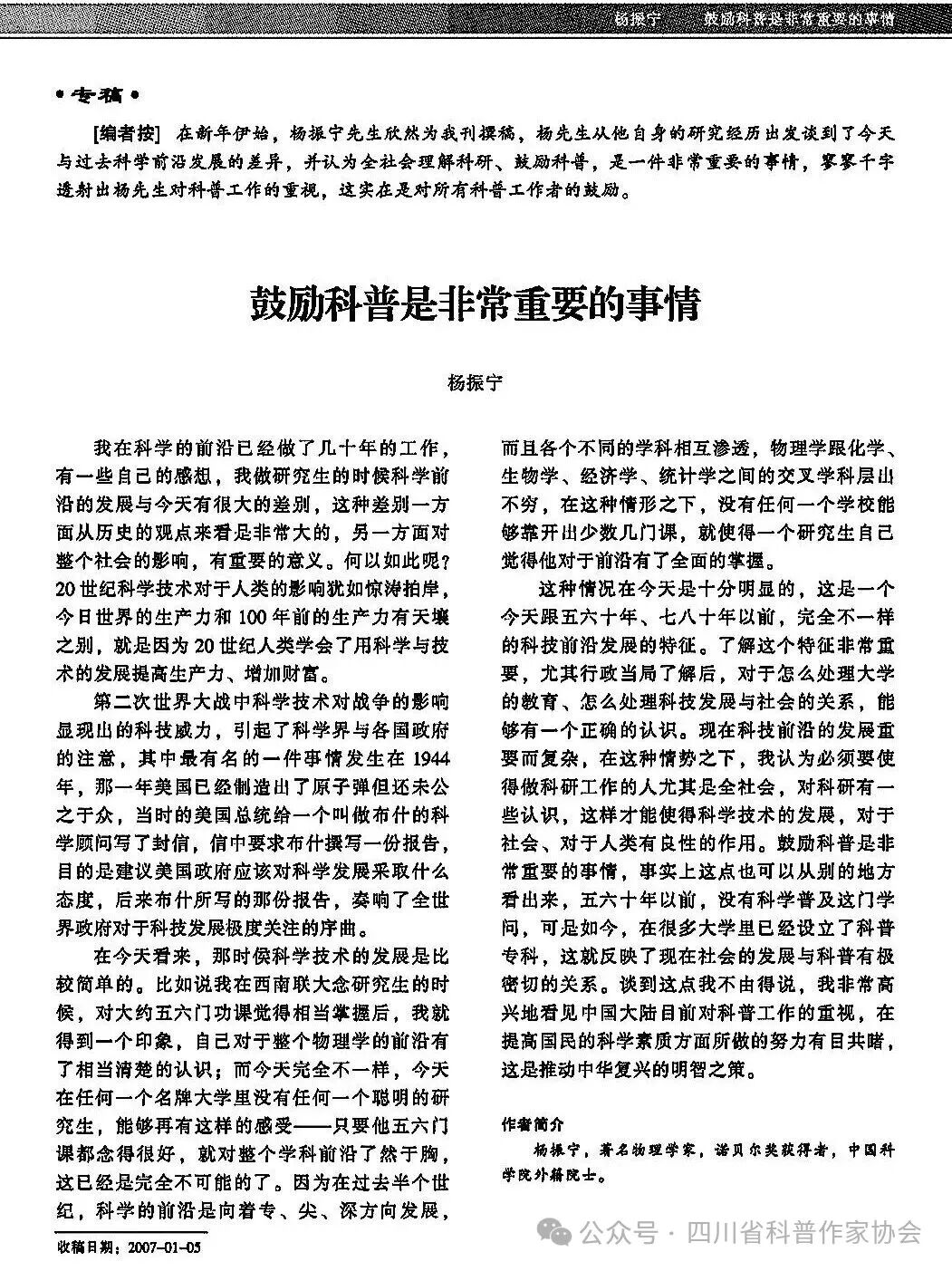 杨振宁先生跨越世纪的一生,为人类文明留下了璀璨印记。他不仅在学术领域成就卓越,更对科学普及事业怀有深切的关怀与期待。先生曾为《科普研究》撰写题为《鼓励科普是非常重要的事情》的专稿,以科学家的洞见与人文学者的温度,深刻阐释了科普对于国家与民族的重要意义。